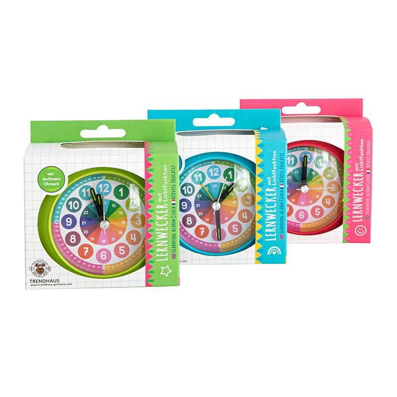Durch das speziell gestaltete Ziffernblatt lernen Kinder spielerisch und schnell die Einteilung des Tages in 24 Stunden, Viertelstunden, 60 Minuten und Sekunden und können lernen ganz einfach, den Alarm einzustellen. Zudem überzeugt dieser farbenfrohe Lernwecker durch ein leises Quarzuhrwerk und durch die integrierte Lichtfunktion, die auch ein Ablesen der Uhrzeit im Dunkeln möglich macht.